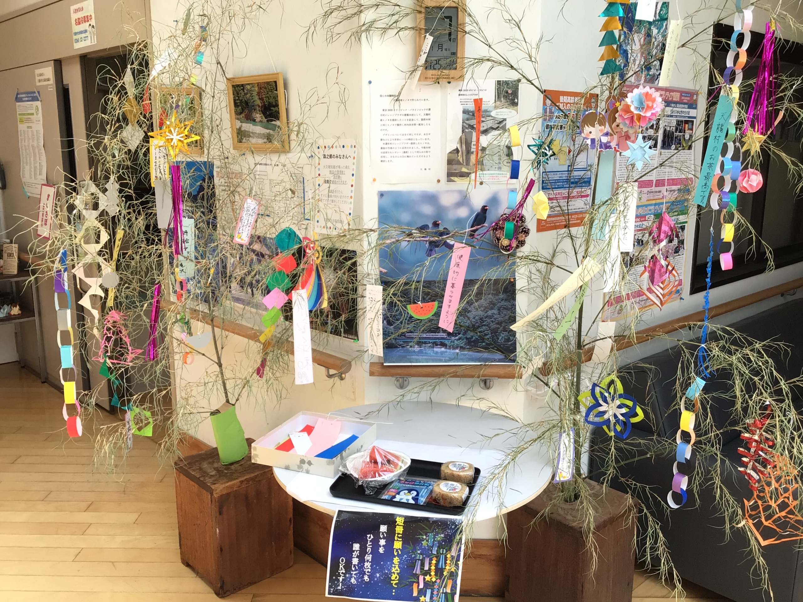 入口に七夕飾りを設置し、入居者の皆様、ご来館いただいた方々、そして職員が、それぞれの願いを込めて短冊を飾りました。色とりどりの短冊が風に揺れる様子は、とても賑やかで華やかな雰囲気を醸し出していました。