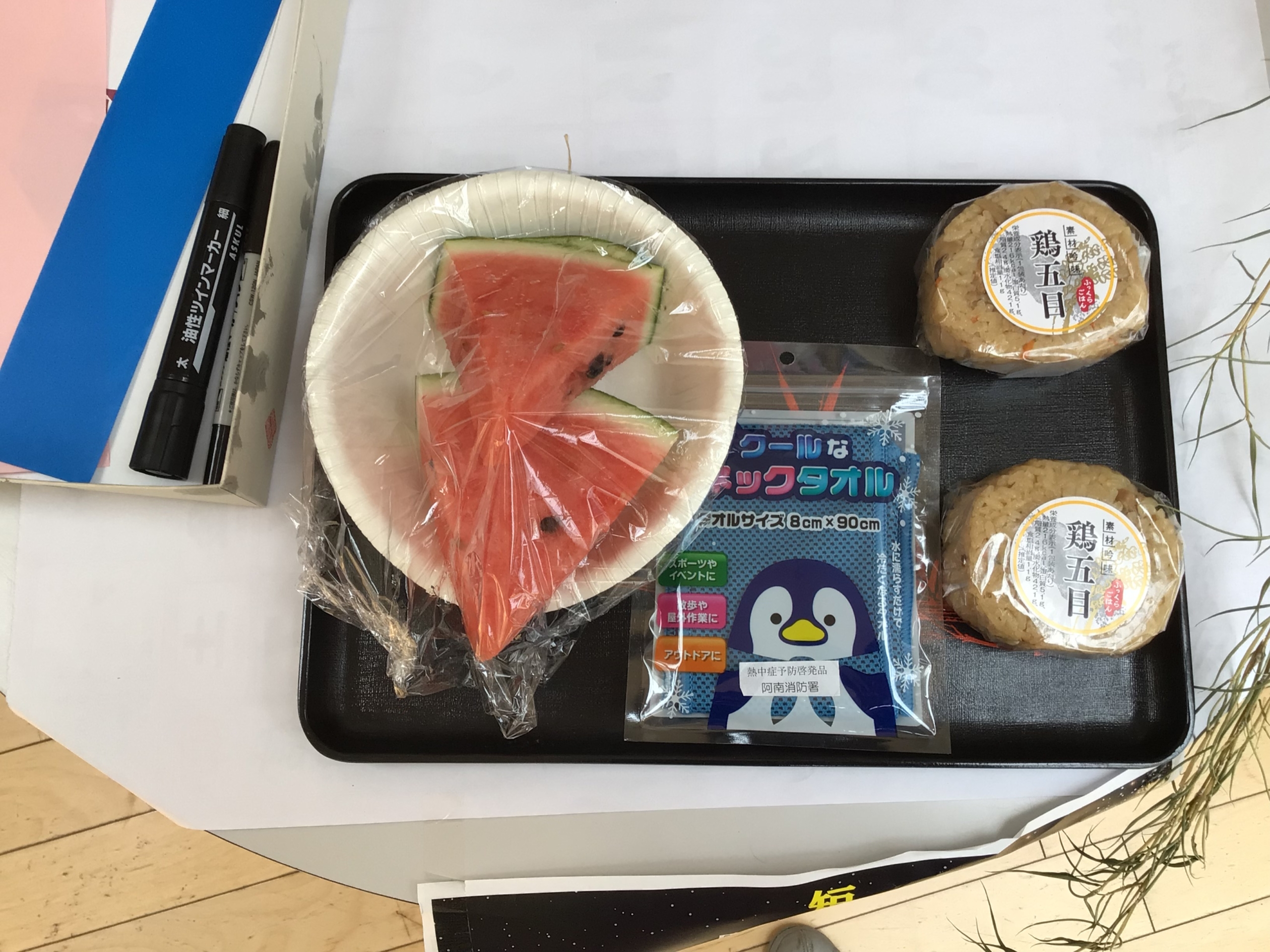 入居者の皆様へは、夏を感じるスイカとおにぎり、首元を冷やせるネックタオルをプレゼントしました。