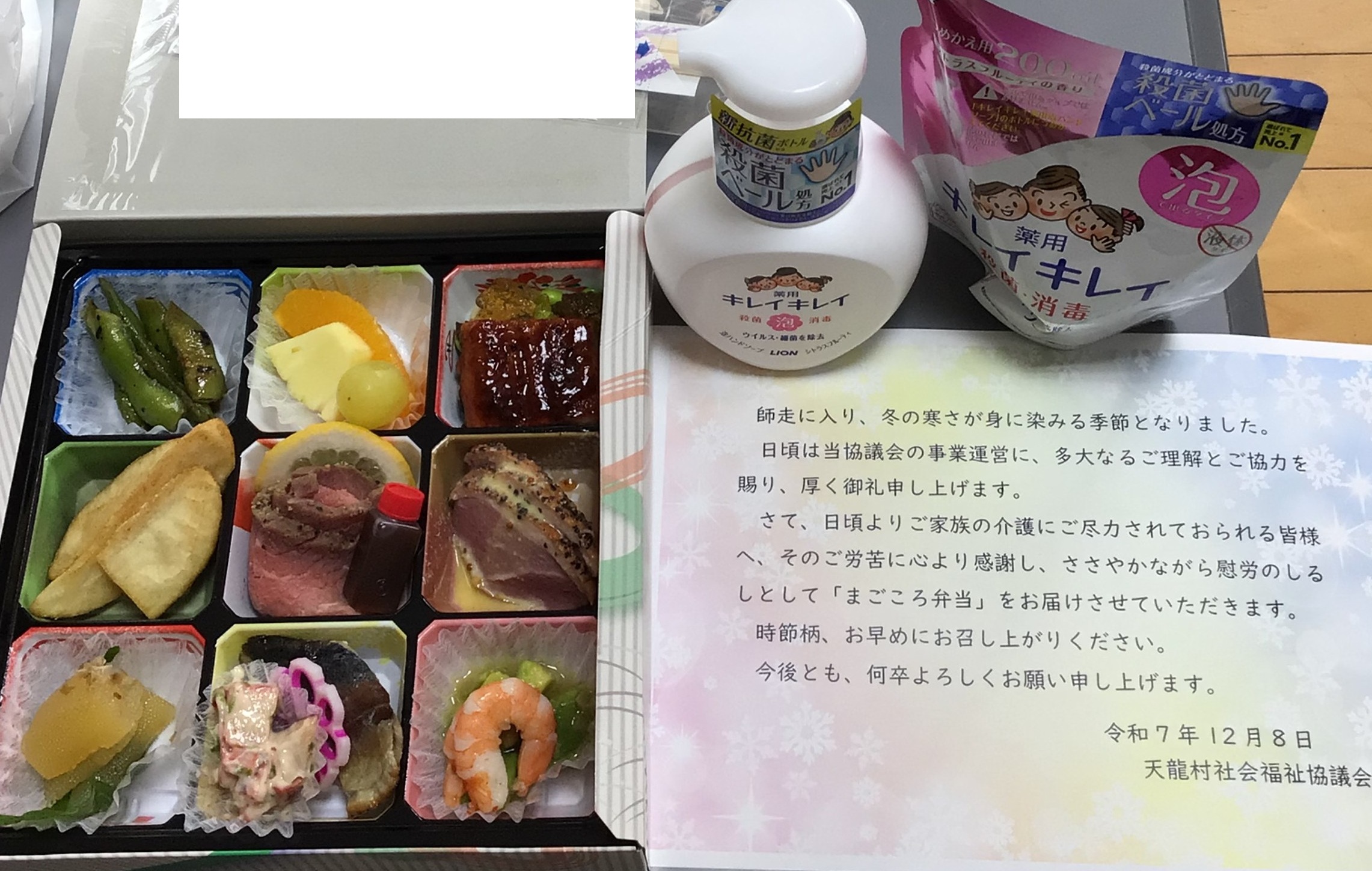 天龍村社会福祉協議会では、日頃からご自宅で懸命に介護を続けておられるご家族を支えるため「在宅介護者慰問事業」を実施いたしました。今年は支援の輪をさらに広げ、昨年を上回る村内32組の皆様へ、お弁当とハンドソープをお届けすることができました。